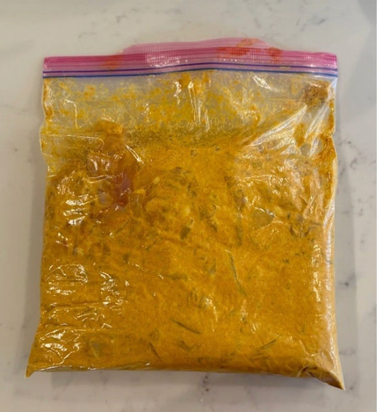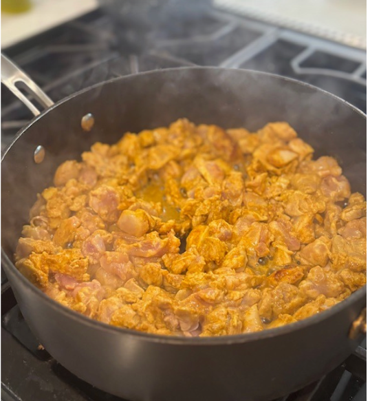 1. Step 1: Mix up yogurt spice marinade and add cubed chicken to marinade.