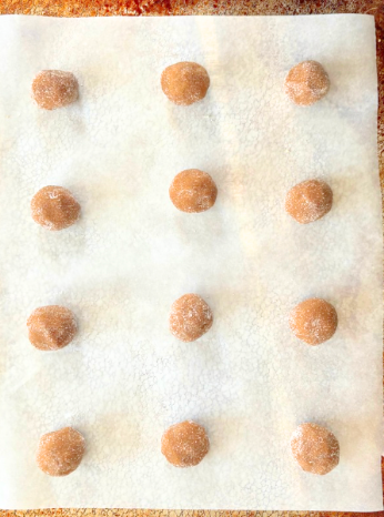 - Scoop 1-tablespoon balls, roll in the sugar mixture, and place on a lined baking sheet.