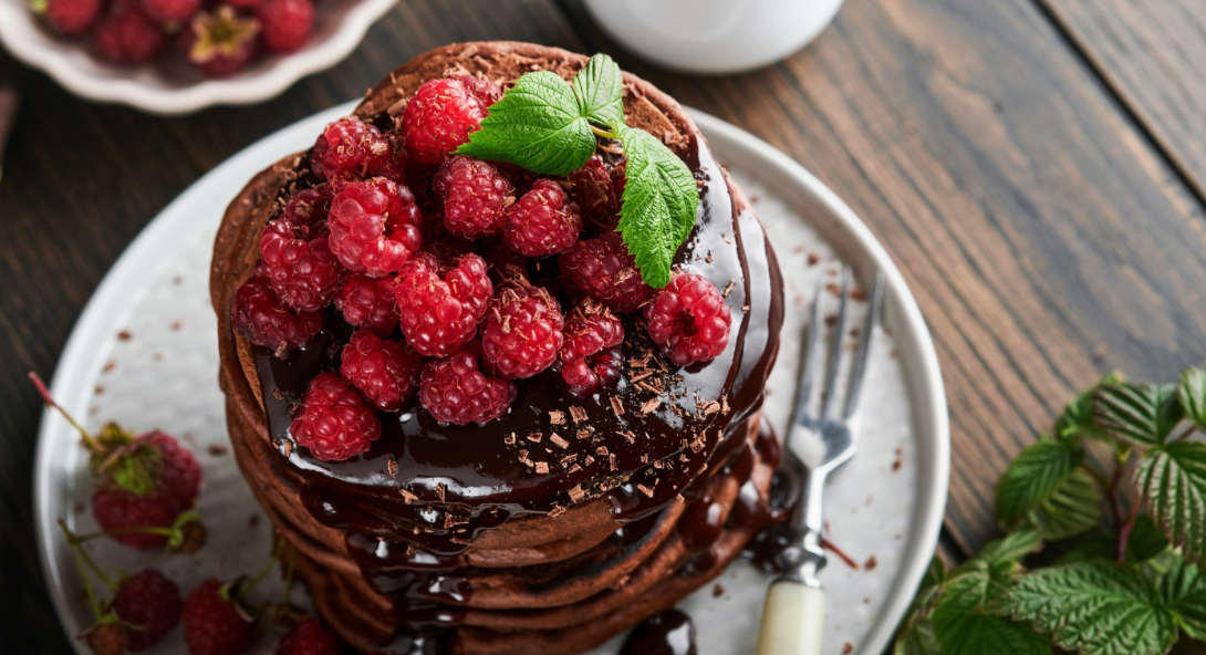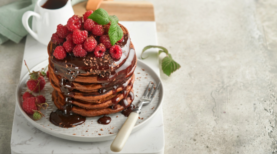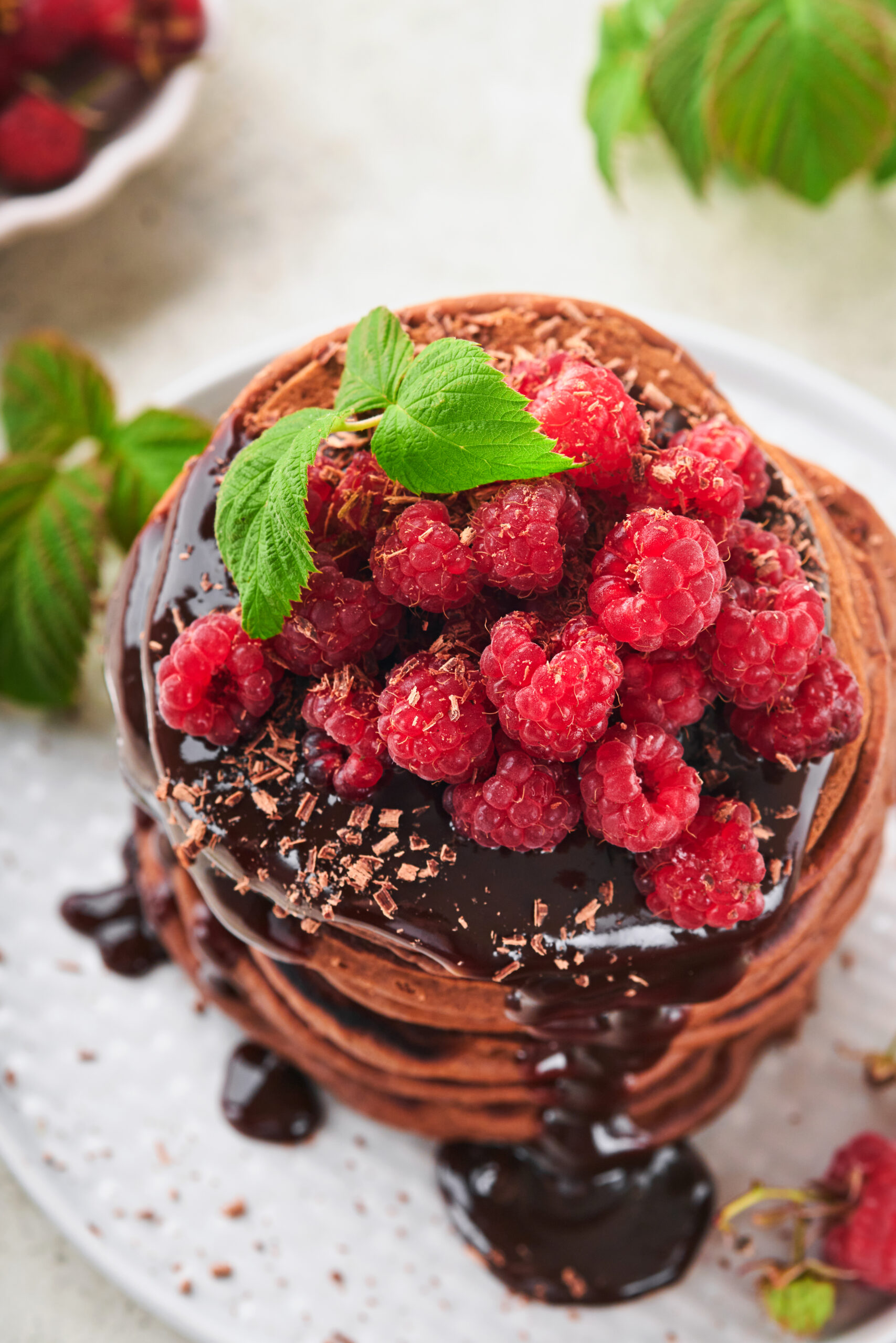 - Stack warm pancakes, pour over chocolate sauce, and garnish with berries, whipped cream, or powdered sugar.