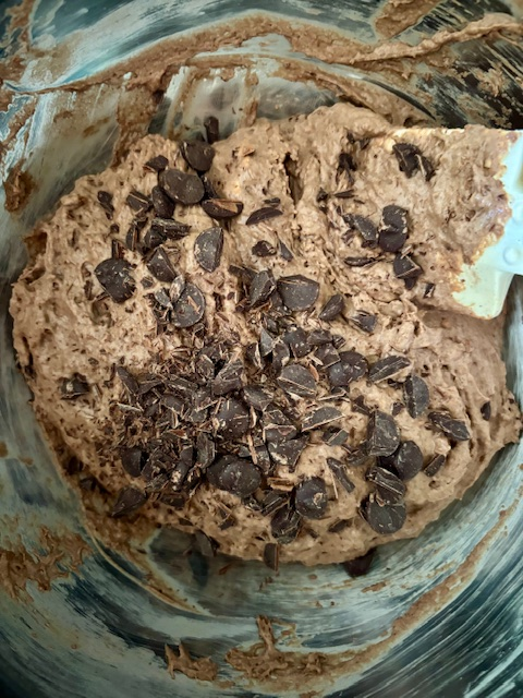- Whisk dry ingredients in one bowl and wet ingredients in another. Combine gently, then fold in chocolate pieces. Batter will be thick.
