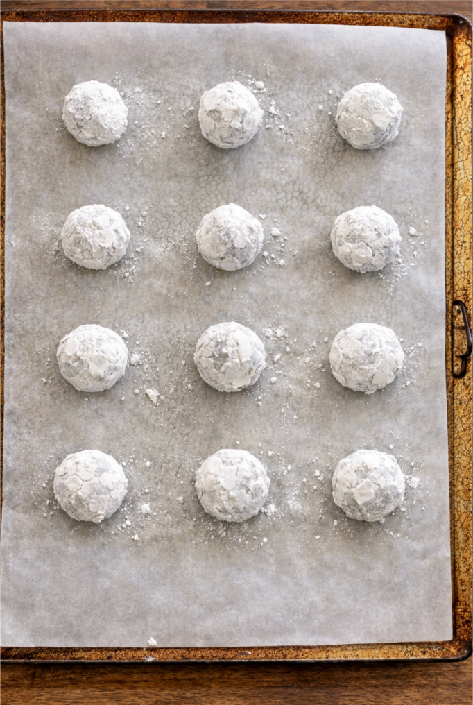 For bold, dramatic cracks, roll the dough balls heavily in powdered sugar. A light coating will melt into the cookie and reduce the crinkle effect.
