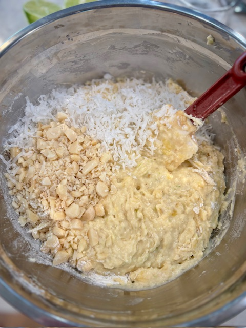 - Step 3: After combining dry to the wet ingredients, gently fold in coconut and macadamia nuts.