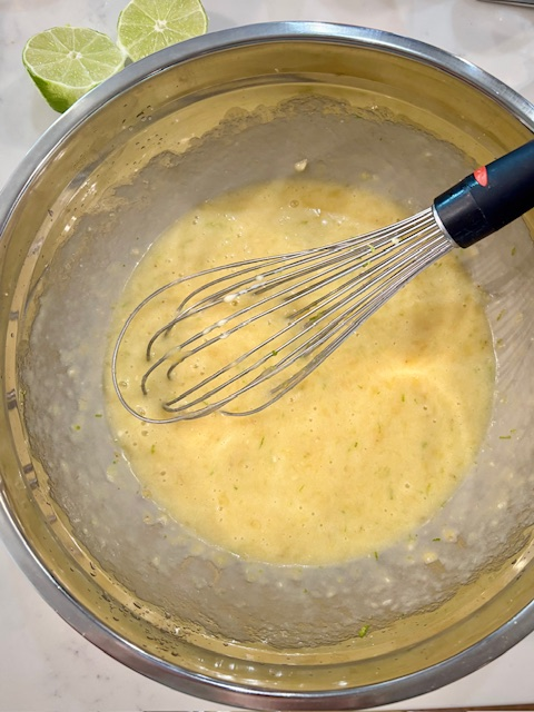 - Mix the wet ingredients: Whisk mashed bananas, coconut oil, sugar, eggs, vanilla, lime zest, and lime juice until smooth and glossy.