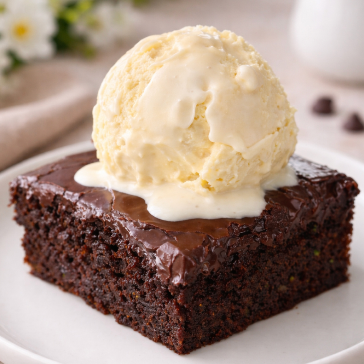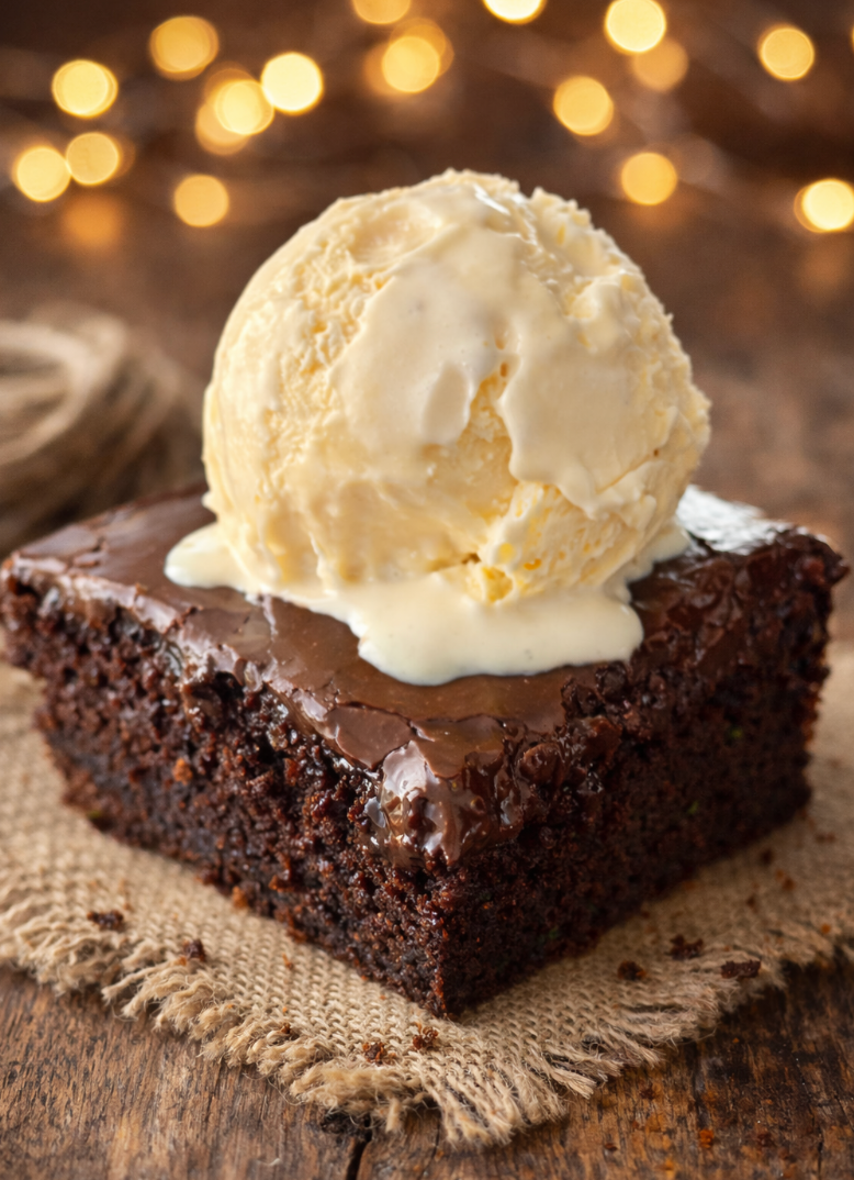 Square of double chocolate zucchini cake with glossy fudge frosting and a scoop of vanilla ice cream on top, showing the moist cake–brownie hybrid texture.