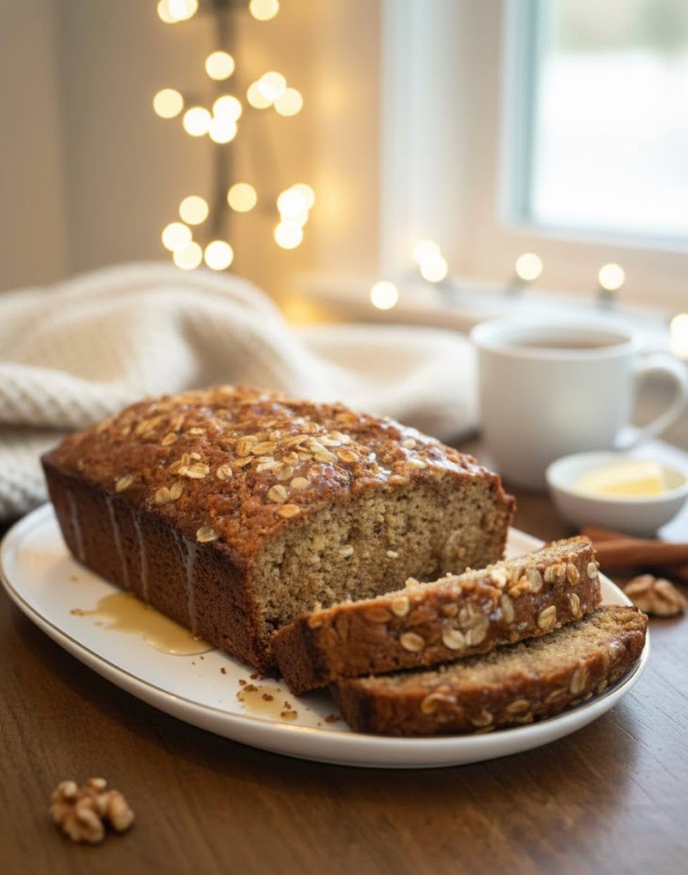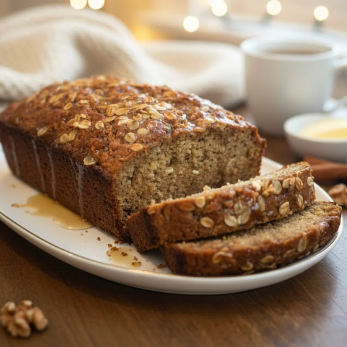 To top it all off, a simple brown butter honey drizzle gives this bread a silky, caramel-like finish, and a scattering of toasted oats adds a gentle crunch. Whether you enjoy it with breakfast, as an afternoon treat, or as a dessert with a dollop of whipped cream, this banana bread brings pure comfort and a touch of sophistication.