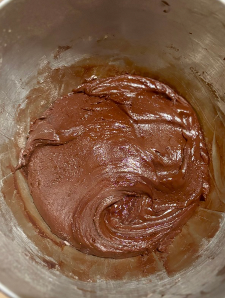 - Pour in the cooled chocolate mixture and mix on low just until incorporated.