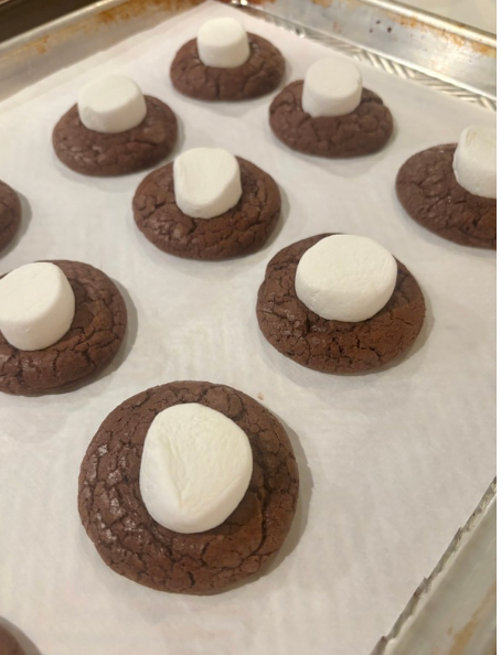 - Remove the cookies from the oven and immediately press a marshmallow half (cut side down) into the center of each cookie. Return to the oven for 2–3 more minutes, just until the marshmallows soften and puff slightly.