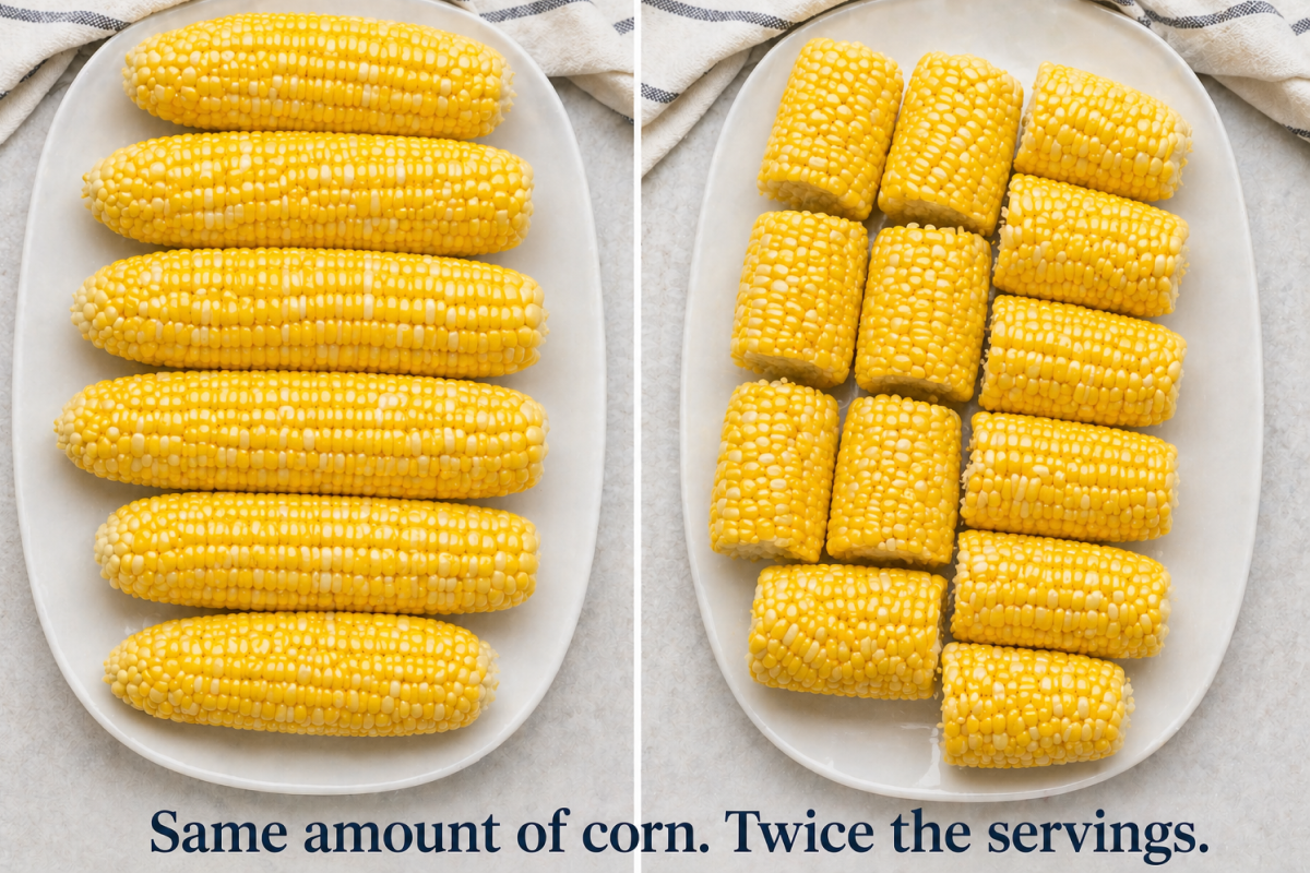 The pro move: cut all the cobs in half before serving. Half-ears are easier for small hands to hold, they cool faster, and you can fit way more of them on a serving platter.