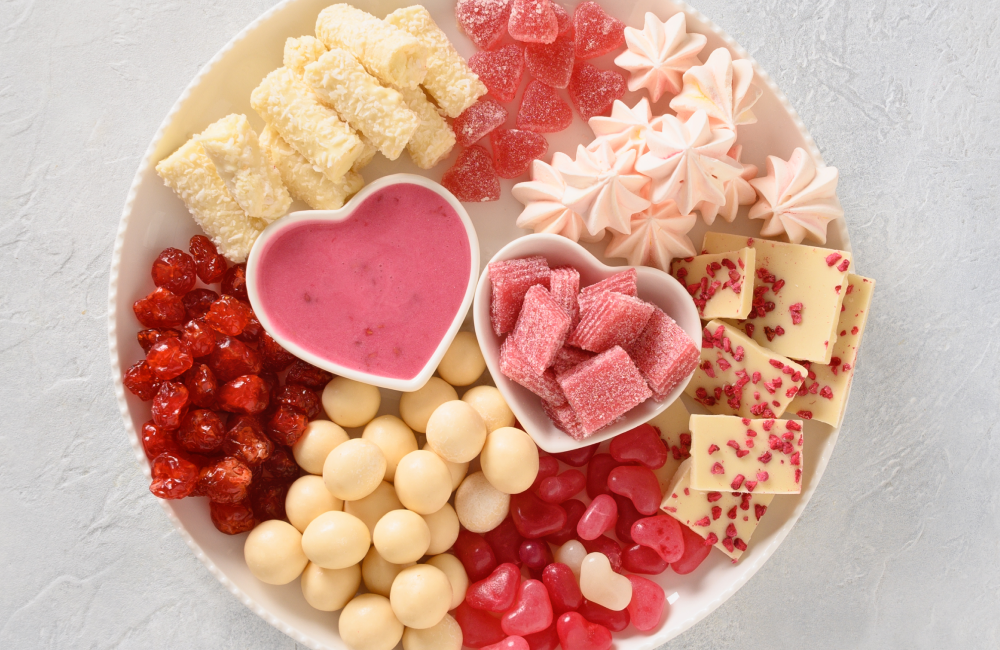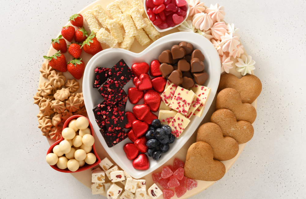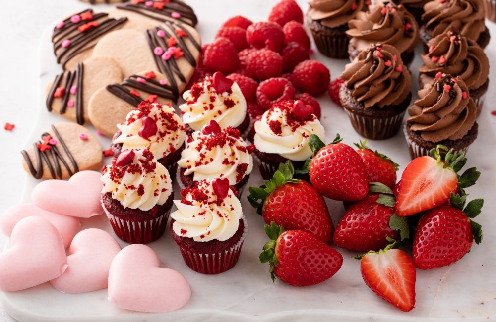 Strawberries, chocolate truffles, pink macarons, heart cookies.