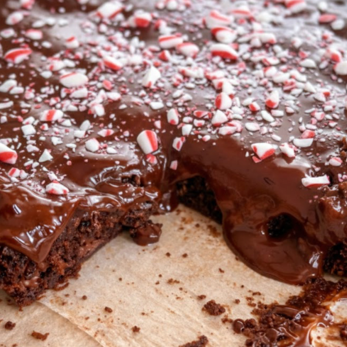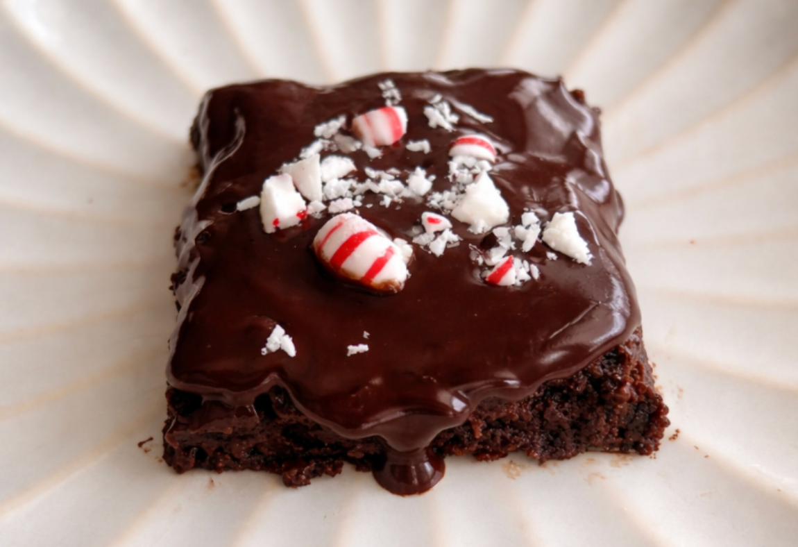 Fudgy peppermint hot chocolate brownies topped with silky chocolate ganache and crushed candy canes.