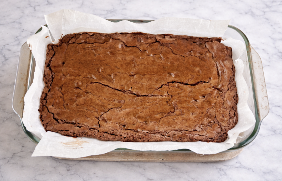 Line a 9×13 baking dish with parchment paper, leaving overhang. This makes lifting and cutting the brownies clean and easy.