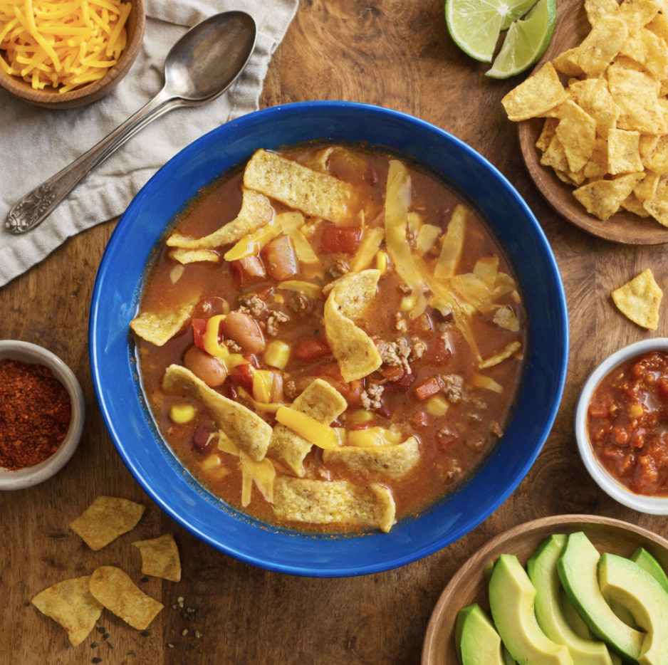 - Serve & Top – Ladle into bowls and top with your favorites: shredded cheese, sour cream, and crunchy Fritos.