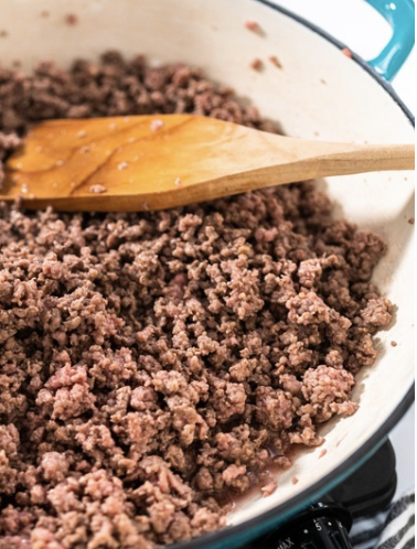 - Brown the Meat – In a large skillet, cook the ground beef (or turkey) over medium heat until fully browned. Drain any excess fat.