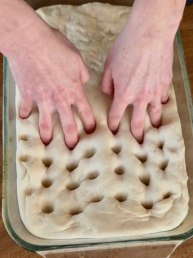 - Step 3: After allowing to rise, generously oil a 9 x 13-inch baking dish. Gently press and stretch the dough into the pan, using your fingertips to create shallow dimples across the surface, just like focaccia.