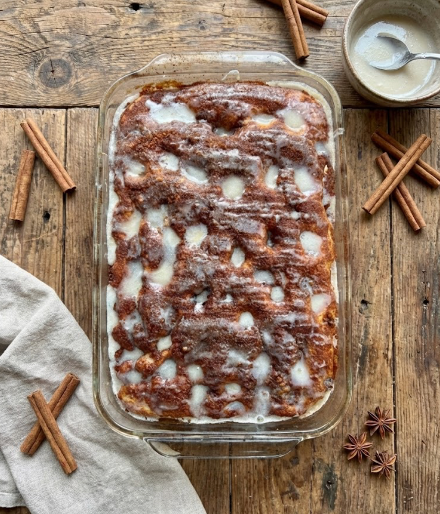Bake until golden, puffed, and bubbling with cinnamon sugar. Once it comes out of the oven, drizzle the vanilla glaze over the warm bread so it melts into every crevice.