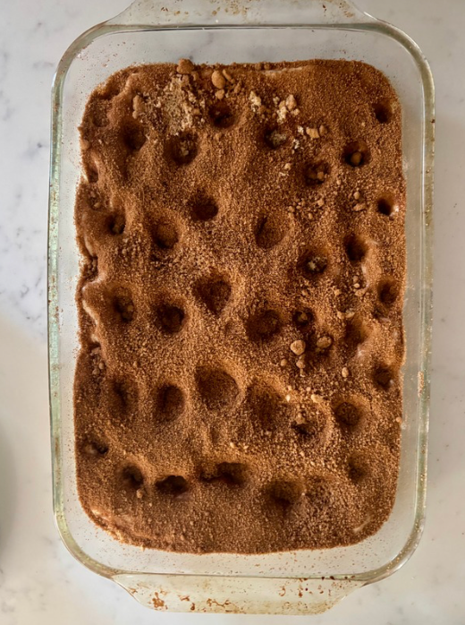 - In a small bowl, mix the brown sugar and cinnamon. Drizzle the melted butter evenly over the dough, then sprinkle the cinnamon sugar mixture over the top, making sure it reaches into the dimples.