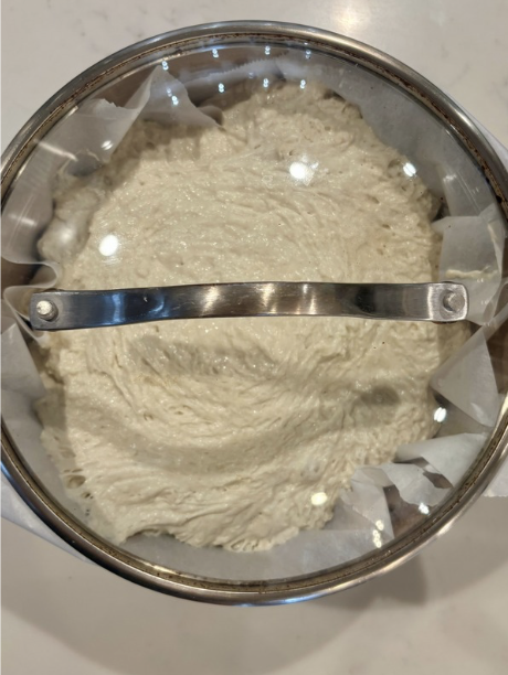 1. Cover the bowl with a plate (not airtight) and let the dough rise at room temperature for 18–24 hours. Try to shape and transfer your dough around the 20–22 hour mark to avoid over-fermenting.