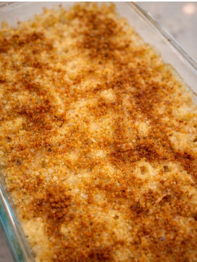Lowering the heat before adding the cheese prevents separation, resulting in a silky, cohesive sauce. Smoked gouda brings rich, savory depth, while sharp and mild cheddars balance flavor and meltability. The panko topping, lightly coated in olive oil and Parmesan, bakes up golden and crisp, creating the perfect contrast to the creamy pasta underneath. Together, these steps produce a mac and cheese that’s rich, balanced, and reliably comforting every time.