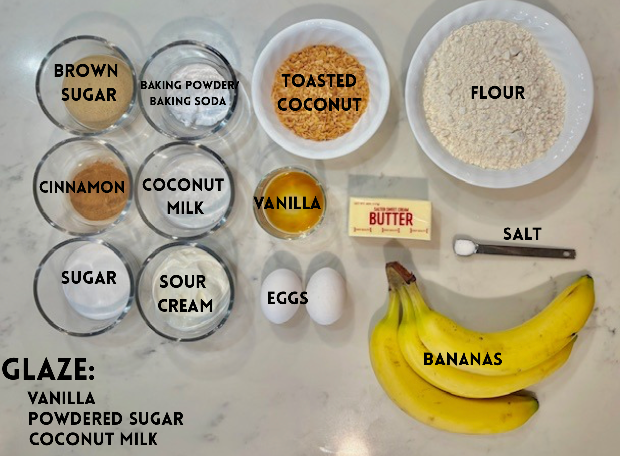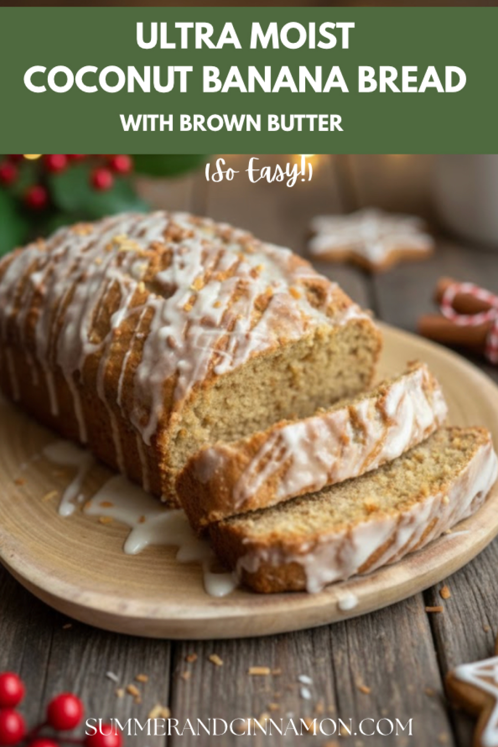 - InstructionsBrown the butter: In a small saucepan over medium heat, melt the butter and cook, swirling occasionally, until golden brown and nutty, about 5–7 minutes. Cool slightly.Caramelize the bananas: In a skillet, mash 3 bananas with a fork. Add 2 tablespoon brown sugar and cook over medium heat for 2–3 minutes until bubbly and caramelized. Cool 5 minutes.Mix wet ingredients: Whisk together browned butter, both sugars, eggs, vanilla, yogurt, and milk. Stir in caramelized bananas.Mix dry ingredients: In a separate bowl, whisk flour, baking soda, baking powder, cinnamon, and salt.Combine: Gently fold dry ingredients into wet until just combined. Stir in toasted coconut (and nuts, if using). Do not over-mix.Bake: Pour into a greased 9×5-inch loaf pan. Optional: place a sliced banana on top. Bake at 350°F (175°C) for 55–65 minutes, or until a toothpick comes out clean.Cool: Let cool 10 minutes in the pan, then remove and cool fully before glazing.Glaze (optional): Whisk powdered sugar, 1½ tablespoon coconut milk and vanilla until smooth. Add more coconut milk as needed. Drizzle over cooled bread and let set for 10–15 minutes.