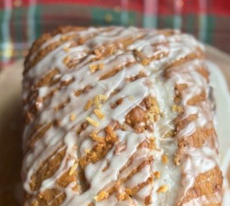 - Step 4: Grease bread pan well and line with parchment paper. Bake at 350 degrees for 55-65 minutes. Cool and top with icing.