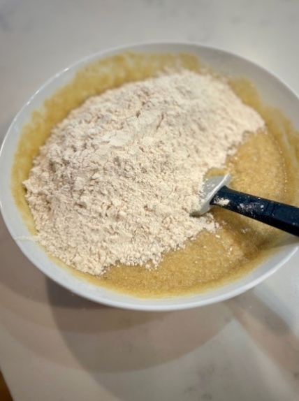 - Step 2: After caramelizing the bananas and mixing wet ingredients, combine dry ingredients into wet.