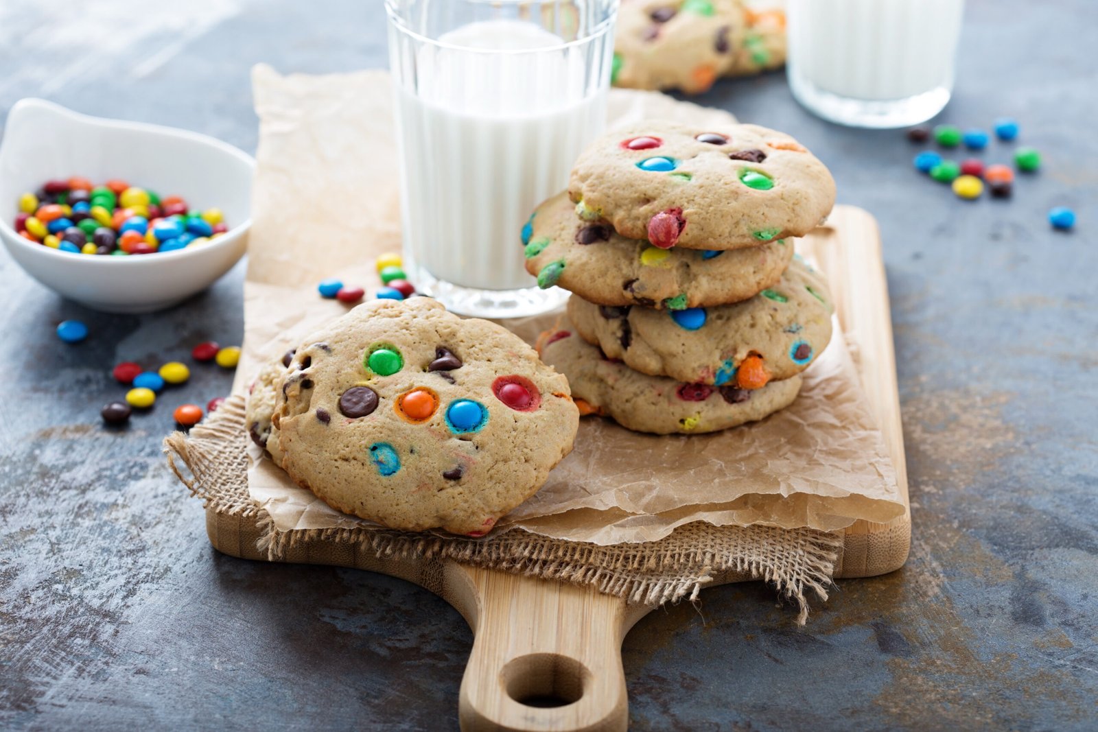 • Brown butter monster cookies with chocolate chips, oats, and M&M candies on a white plate